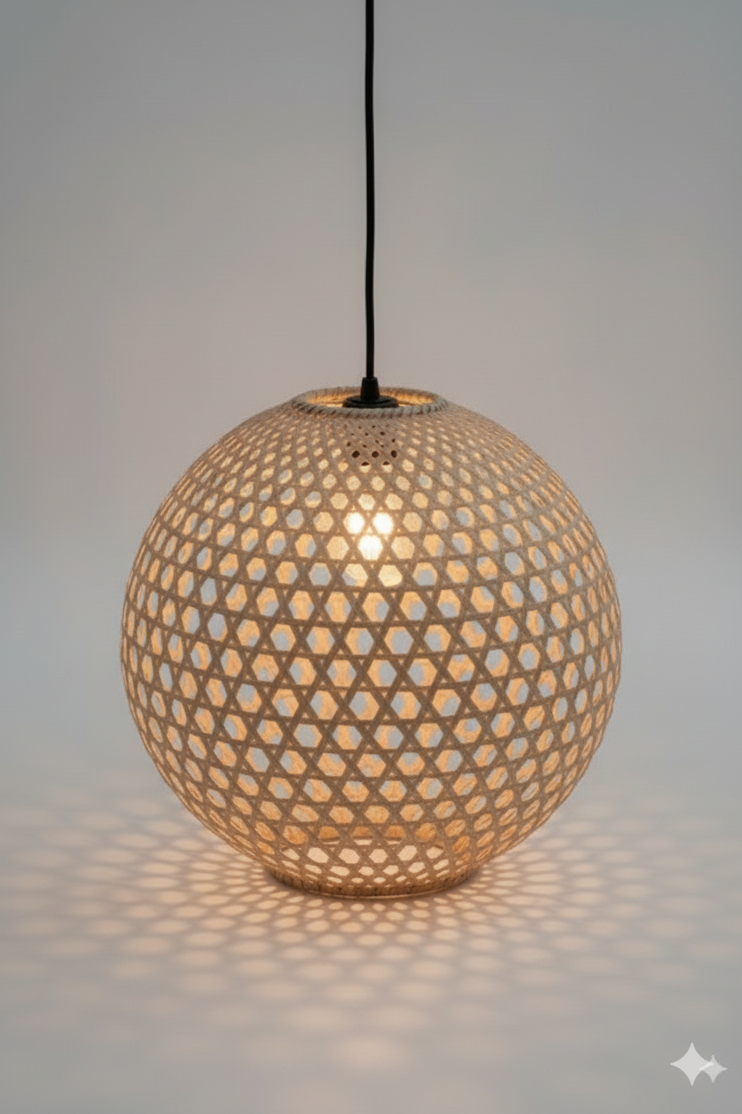 Esfera Zen es la lámpara que te transporta a la calma con su diseño minimalista y tejido natural. La luz suave y el patrón de sombras crean un ambiente mágico. ✨